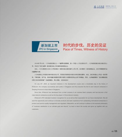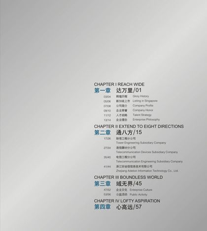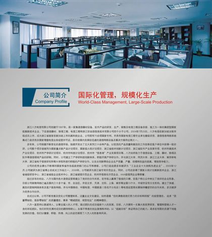 浙江八方電信有限公司創(chuàng)建于1997年,是一家集通信器材設(shè)備、軟件產(chǎn)品的研發(fā)、生產(chǎn)、銷售及電信工程設(shè)備安裝、施工為一體的集團型國家級高新技術(shù)企業(yè)。下設(shè)通信器材、鐵塔工程、電信工程和浙江安迪信信息技術(shù)有限公司四個分子公司。2004年7月23日,八方電信在新加坡主板市場成功上市,成為浙江省首家在新加坡上市的高科技企業(yè)。公司現(xiàn)有百余項國家專利,并具有國家電信工程專業(yè)承包壹級資質(zhì)、通信信息網(wǎng)絡(luò)系統(tǒng)集成乙級資質(zhì),是目前國內(nèi)發(fā)展較迅速的通信網(wǎng)絡(luò)設(shè)備及解決方案供應(yīng)商之一。 銘陽廣告公司作為八方電信集團主要的平面設(shè)計業(yè)務(wù)合作商,先后為其做過畫冊設(shè)計、期刊設(shè)計、工廠環(huán)境設(shè)計、辦公及車間內(nèi)企業(yè)文化宣傳設(shè)計等,產(chǎn)品及服務(wù)受到八方電信集團各部門一致好評。