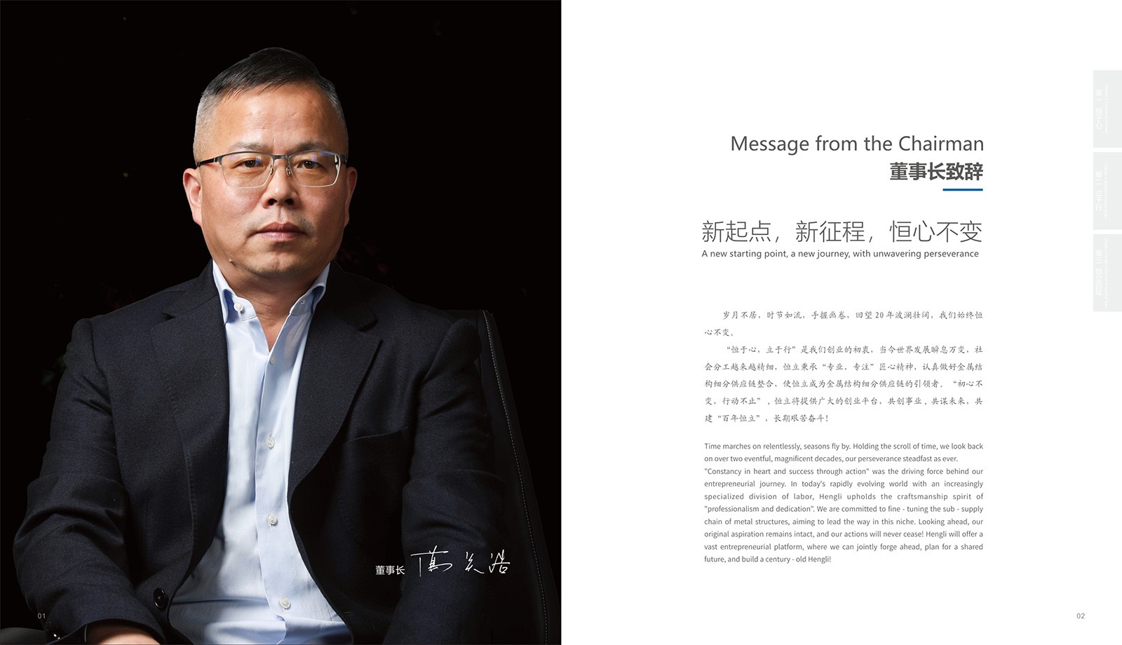 確定設計要求:設計團隊經過與甲方充分溝通,明確畫冊主題、內容范圍、風格偏好等。以“恒與心,立于行,恒立百年”為核心主題,把畫冊分成三個篇章,在內容上會涵蓋公司概況、